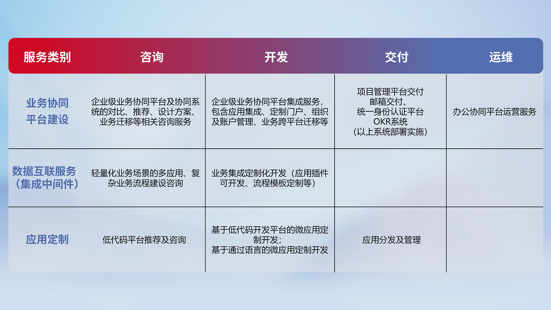 针对钉钉、、、、企微、、、、IDaas等平台级产品提供产品的规划、、、、方案、、交付、、、定制化开发等服务,,,实现如统一协同办公、、、、智能客户服务、、混合会议管理、、、智能数据查询、、、等业务场景,,,实现数字化转型。。。。