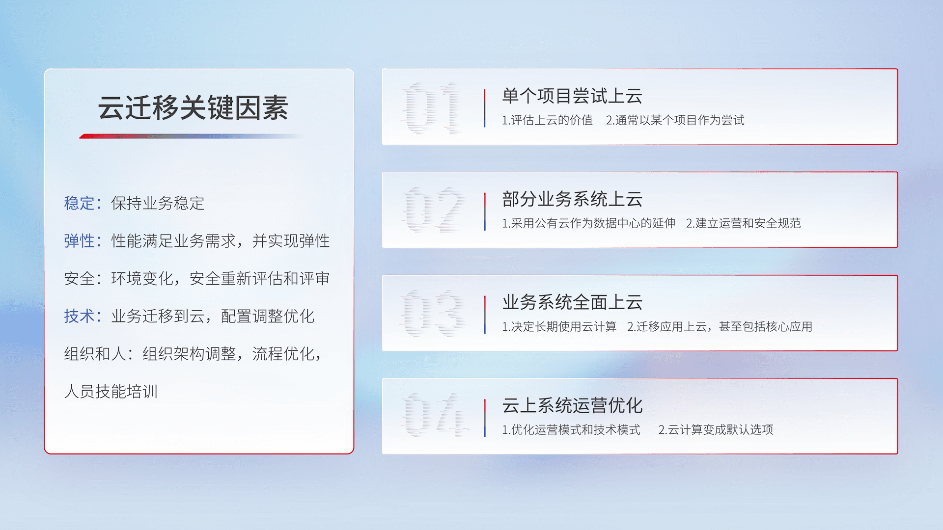 结合实际业务,,,,从规划设计、、、云平台选型、、、、云原生改造、、、数据迁移、、、集成交付,,,,迁移全过程为客户识别最佳上云路径,,,,做好风险识别管理,,,,设计网络架构、、、、身份权限、、、安全审计合规、、、、操作审计、、日志审计、、、、监控告警策略、、多站点容灾设计等,,,,对云上基础设施进行整体规划,,,,提升IT治理水平,,以满足弹性、、高可用、、、、高性能的需求。。。