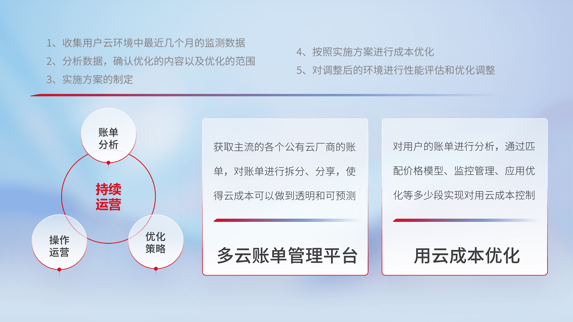 通过多云纳管,,,以统一的资源数据模型把客户的云资源进行抽象和封装,,进而实现对多云资源的统一操作,,,,保障云资源管理的可靠性、、、稳定性与可用性。。。。量身定制化运维内容,,配置、、、、开发运维、、、、补丁管理、、、、备份、、、、监控、、、认证和访问管理、、、、审计和日常巡检等,,,保障在用云过程中的可靠度,,,,稳定度以及高可用率。。。。