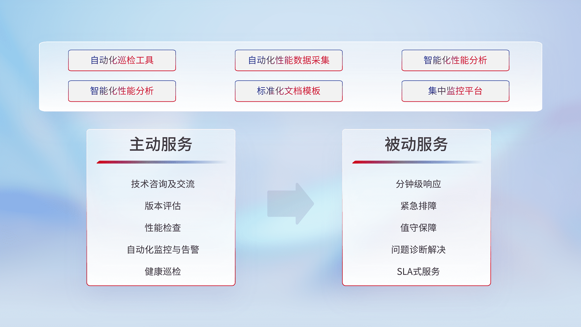 智能化工具和标准化文档,,,,保障服务质量,,,,提供主动服务(包含技术咨询、、、版本评估、、性能检查、、、、自动化监控与告警、、健康巡检)和被动服务包含(分钟级响应、、、紧急排障、、、值守保障、、、问题诊断解决、、、SLA服务)。。。。